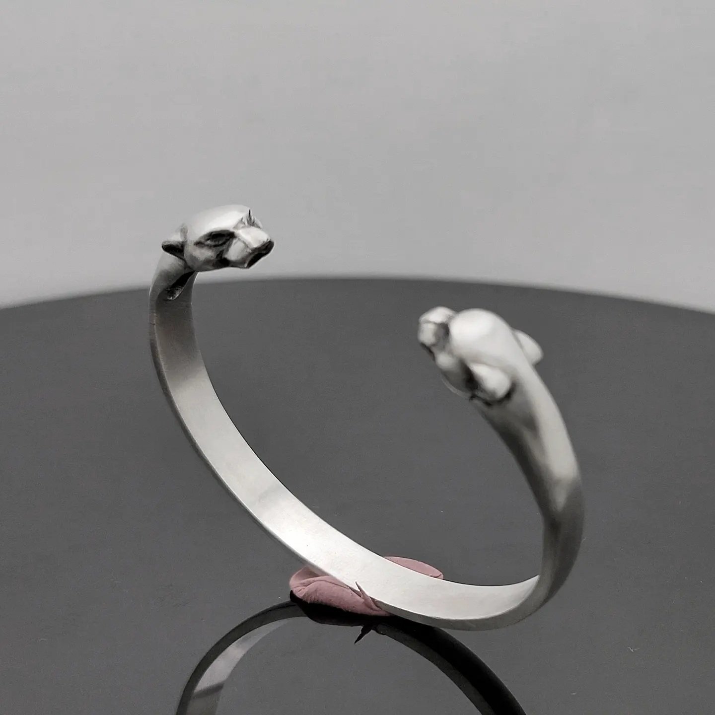 Brazalete escultural con forma de cabezas de felino en plata 950