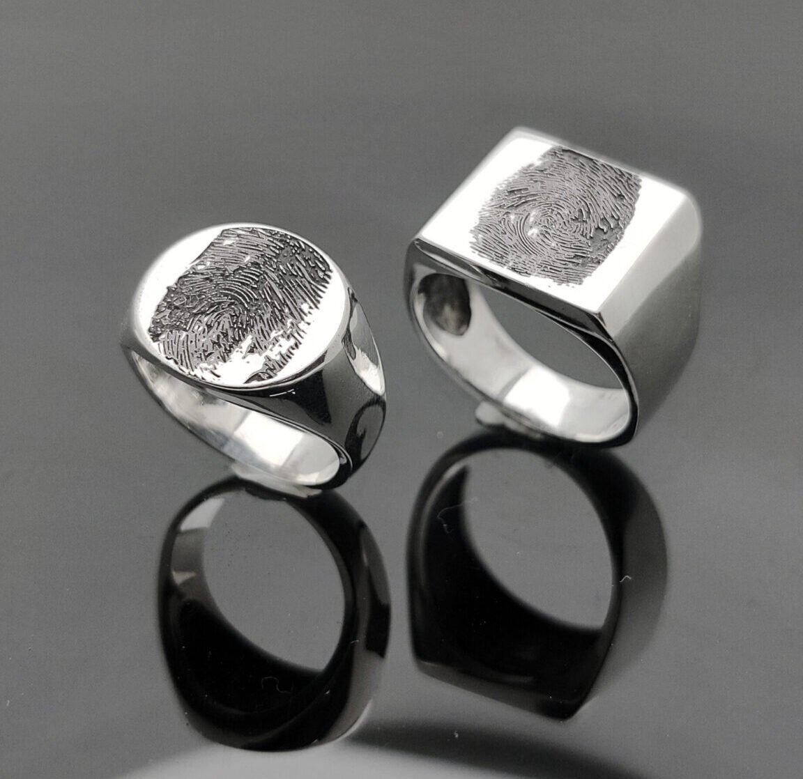 Estos anillos de pareja están fabricados artesanalmente en plata 950 y llevan grabada la huella digital real de cada persona, transformada en un patrón único e irrepetible.